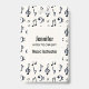 A name tag with a musical themed design. A pattern with treble clef, bass clef and other musical symbols.