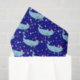 A cute illustration of a narwhal wearing a Santa hat against a blue background with snowflakes.