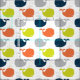 Adorable little whales in blue, grey, orange and green.