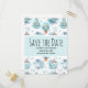 Save the date postcard with a whimsical pattern featuring whales with fish and lighthouses and other nautical elements.