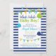 Our cute baby boy in navy blue features a play on words -- "Whale, Whale! -- little whales in green and blue, and adorable bunting flags, and is set on a navy blue and white striped background. The modern typography is in matching shades of green and blue. #BabyBoy #BabyShower #Whales