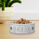 Cute coastal style dog bowl for your beach house or island abode features the words "beach dog" in smoky harbour blue farmhouse style lettering on a white background accented with narrow navy stripes and a pair of starfish.