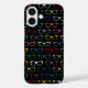 A cute and nerdy iPhone 16 case with a colourful hipster eye glasses pattern on a black background. Ideal for bookworms, geeks, opticians, and more!