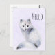 A postcard with a watercolor image of a white fox with fancy blue flora designs all over its fur.