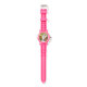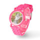 A curious young kitten, white with tortoiseshell patches, with beautiful blue eyes sitting upright in a small wicker chair in a colourful flowering garden and watching curiously. A cute baby cat photo taken by Katho Menden. This watch with dial plate is a gift idea for kids and cat lovers.