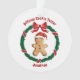 A cute cartoon gingerbread cookie wearing a Santa hat inside a stylistic Christmas wreath under the words “Official Cookie Taster.”