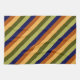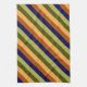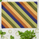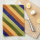 A kitchen towel featuring a pattern design of multicolored diagonal stripes in olive green, sage green, hazelnut brown, navy blue, and banana yellow.