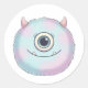 Adorable one-eyed fluffy monster cartoon character with soft pastel blue and pink fur, small horns, and a friendly smile. High-resolution cute Cyclops mascot illustration isolated on background. Perfect for kids designs, stickers, nursery décor, t-shirts, greeting cards, branding, and social media graphics. Whimsical fantasy creature with big eye and kawaii expression.