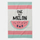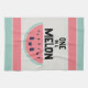 Cute, kawaii kitchen towel featuring an adorable slice of watermelon with bight eyes and a sweet smile. Above the melon slice are the words One In A Melon in black lettering.
