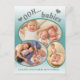 Cute, modern, and stylish teal photo birth announcement for the family who is welcoming twins into their home. Designed for the new twins with older sibling(s). Text says, "Ooh babies." and has two cute hearts. Add 3 photos to the collage on the front along with the names of the babies. The back has space to add all of the information you would like to share with friends and family.