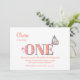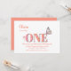 Pretty peach and pink 1st birthday party invitation with peach/soft orange text and the number ONE displayed in a soft pink graduating to a peach tone, and decorated with pink flowers, along with a beautiful soft blush pink butterfly sitting on the E.