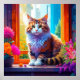 Adorable ai created orange and white striped cat sitting in a city window surrounded by pink, orange and purple flowers.