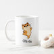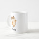 Cute illustration of a cartoon orange cat standing on one back leg with the other leg lifted behind her. Her front legs are stretched out to her sides. She has two darker stripes on her head and a light cream belly and cheeks. With big dark eyes and a happy smile this kitty is adorable. Below the illustration is a template in black lettering to add your name or other text to personalise.