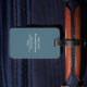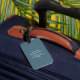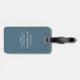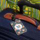 Personalised luggage tag with a pattern made with cute and happy orange foxes. Dark green background. Little mushrooms and leaves sprinkled about.