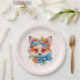Paper plates with an illustration of an adorable fox portrait with a blue and orange floral crown and collar.