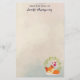 Personalised stationery with a cream coloured background with trendy faint geometric shapes. Layered over top is a cartoon drawing of a cute orange fox sleeping peacefully. A green leaves wreath with 3 little red hearts behind. A cutesy design.