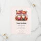 Save the date card with an adorable image of 2 foxes wearing cute rose tinted heart glasses. Decorated with heart accents.
