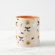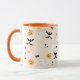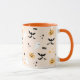 Cute coffee mug featuring whimsical Halloween ghosts, pumpkins, spiderwebs and bats against a light orange backdrop.