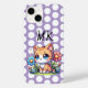 An adorable kitten sitting in a patch of blue and pink flowers and white polka dots personalised phone case.