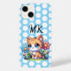 An adorable kitten sitting in a patch of blue and pink flowers and white polka dots personalised phone case.