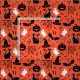 Shows pumpkins, ghosts, witches hats, bats, and spider webs in a seamless pattern. Black and white Halloween objects on an orange background.
