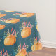 A tablecloth illustrated with a repeating pattern of a watercolor illustration of an orange pumpkin decorated with colourful fall leaves and sprigs.