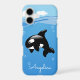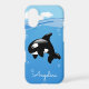 Adorable cartoon chubby Orca whale with a tiny white heart near its tail.