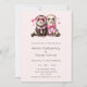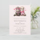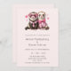 Wedding invitation with a cute illustration. A pair of otters in pink people clothing. Wearing striped shirts and one wearing a tie and the other wearing a bow. Surrounded by love hearts.