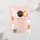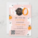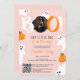 Celebrate the upcoming arrival of your little one with this adorable Halloween-themed baby shower invitation! The design features a playful pastel pink background adorned with cute ghost illustrations, an orange pumpkin, and a bold "BOO!" headline in a whimsical font. At the top, there's a spot for a customisable photo, adding a personal touch to the invitation. The invitation reads, "Our Little Boo is on the way!" with A handy QR code at the bottom makes it easy for guests to get more details and RSVP. Perfect for a Halloween-themed baby shower, this invitation combines festive elements with charming illustrations graphics, ensuring a delightful and memorable event for everyone involved.