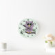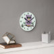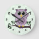Custom Wall Clock with a vector graphics art design of a cute pink owl on a branch with leaves and a green floral pattern background with a Victorian font clock face.