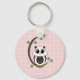 Custom Basic Button Keychain with a vector graphics art design of a cute pink, white, and black owl on a crescent moon shaped branch with leaves and a pink polka dot pattern background.
