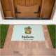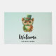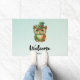 A welcome doormat with a wonderful whimsical illustration. A big eyed brown owl wearing a fancy green top hat and bow tie.
