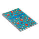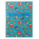A stylish Spiral Notebook to personalise, with a pattern of cute owls in red, blue, green on a turquoise background. The owl pattern was an original handpainted paper collage design by Judy Adamson.