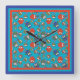 A stylish square Wall Clock, with a pattern of cute owls in red, blue, green on a turquoise background. The owl pattern was an original handpainted paper collage design by Judy Adamson.