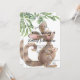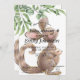 Baby shower details are an easy-to-edit template in contrasting fonts on a card that features an adorable watercolor Aussie kangaroo mum and baby, touched with gold highlights. Watercolor painted foliage is on diagonal corners. The back of the card features the same enchanting kanga mum and joey, slightly larger.