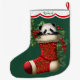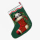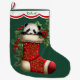 This Holiday stocking has an image of an adorable baby panda bear peeking out of an ornate red stocking. The image is surrounded by holly, red berries, and poinsettia blooms, and is placed on a Christmas green background. A white scalloped edge design bordered in red holds your customised name at the top. The back of the stocking is identical to the front.
