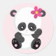 A cute panda bear on a pink background, this bear is waving at you. She has a lovely pink flower on her head. Place your order for these panda bear stickers today!
