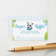This cute baby shower diaper raffle cards are in a tropical panda theme. There is a cute boy panda playing with a car with a blue and green tropical foliage at each corner. The background as well as the backside of the cards has a watercolor blue stripes design.