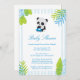 This cute baby shower invitation is a panda theme perfect for a little boy! It features blue and green tropical leaves at each corner with a watercolor stripes background. At the top, there is a cute boy panda playing with a car.