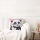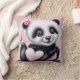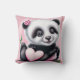 This is an illustration of a panda holding a pink heart. The background is pink with 2 bamboo leaves. The panda is black and white with fluffy fur and is sitting. The panda is a symbol of peace, harmony, and gentleness. It is a gentle creature that lives in balance with nature. The panda bear's expression is adorable, making this image a heartwarming sight.