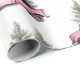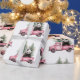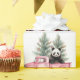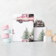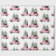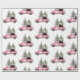 Cute Panda in Pink Vintage Truck wrapping paper. Watercolor drawing of a cute white panda bear in a pink vintage truck and Christmas trees with ribbons.