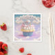 This whimsical design will be a hit at the party. It features a large extravagantly decorated cupcake surrounded by soft fluffy clouds.