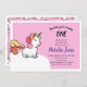 First birthday invitation card in pink, featuring a cute chubby baby unicorn. On the other side a unicorn pattern with stars, rainbows, candy, moons and bows.