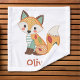 This personalised kids' wash cloth features a cute, whimsical fox created in a patchwork style. The fox is designed with a mix of colourful, patterned fabrics, including polka dots, stripes, and leafy textures.