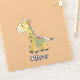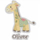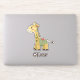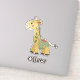 This charming sticker features a friendly, whimsical giraffe created in a cute patchwork and stitched style, surrounded by green leaves.