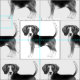 Pattern featuring Destei's original black and white colour illustration of a cute Beagle breed dog drawn in digital ink wash style. The dog is standing and he is pictured from his side. The dog is looking towards the viewer with his large floppy ears framing his face and his long tail pointed upwards in typical Beagle fashion.