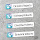 Clothing labels featuring a white paw print on a purple and aqua blue watercolor splash background and your name or other custom text.