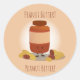 Sticker with an illustrated design of a smiling peanut butter jar that is standing between two piles of peanuts. The words “Peanut Butter? Peanut Better!” show above and below the cartoon character. All of the words can be customised.