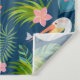 Cute pelicans with colourful tropical flowers in a seamless pattern with a blue background.