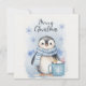 A charming winter illustration of an adorable little penguin wearing a blue striped hat and scarf, bringing a cosy and festive vibe. The soft snowflakes and gentle blue tones in the background create a magical winter atmosphere. Perfect for Christmas cards, posters, stickers, and seasonal crafts!